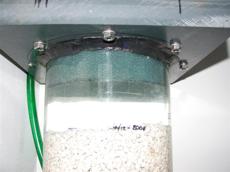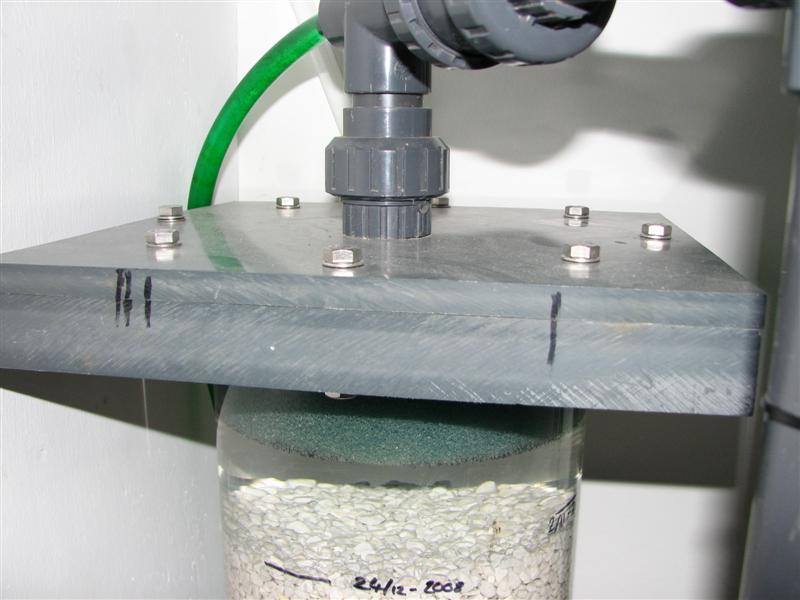 I bunden sidder der så et lille powerhead til at cirkulere vandet rundt i reaktoren, og det er desuden her der fyldes Co2 ind. Røret er gennemsigtigt for at man kan se om der kommer Co2, men jeg har nu alligevel en bobbeltæller ved siden af for at styre det præcist. Der er lige ledes en svamp i bunden som er hævet en 3 cm op på pvc stykker så pumpen kan pumpe frit ud og presse vand op gennem hele bundfladen af reaktoren.