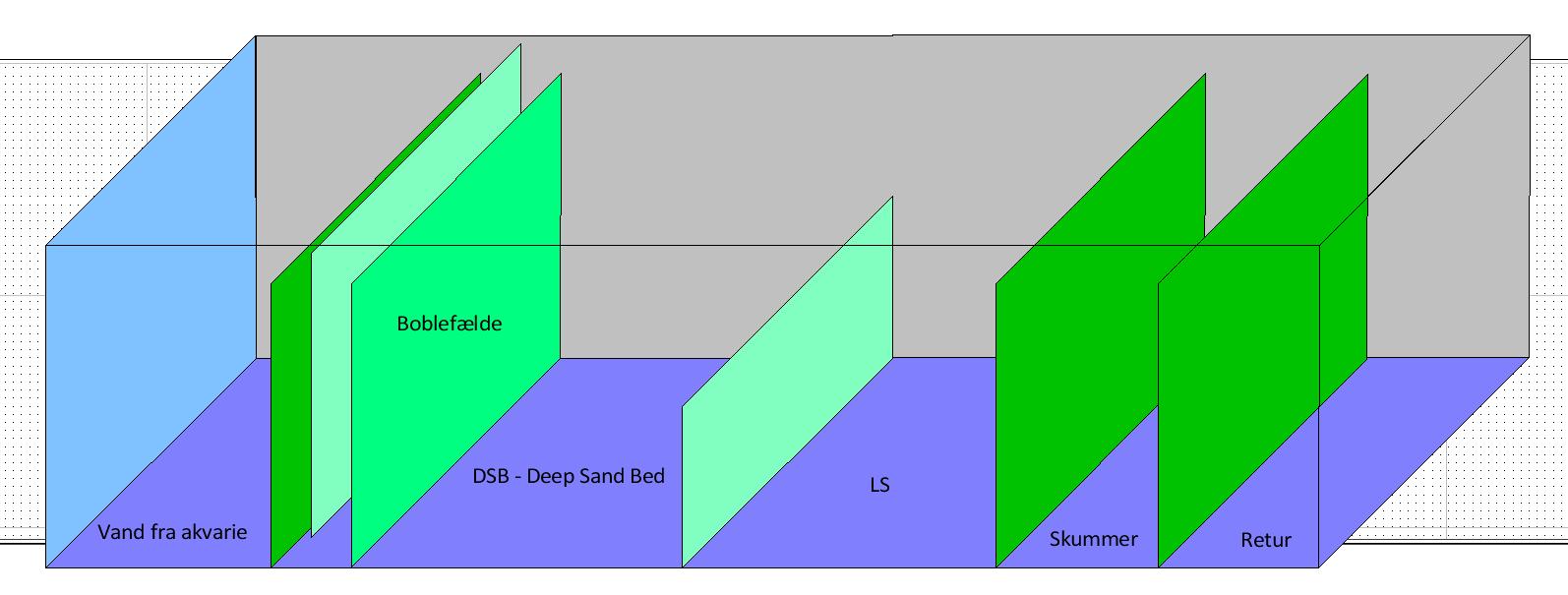 manio skrev:ok, setup´et bliver sådan, kammer til vand fra akvariet derfra via boblefælde og så kammer til DSB og kammer til LS og så kammer til skummer og det sidste kammer til retur pumpe