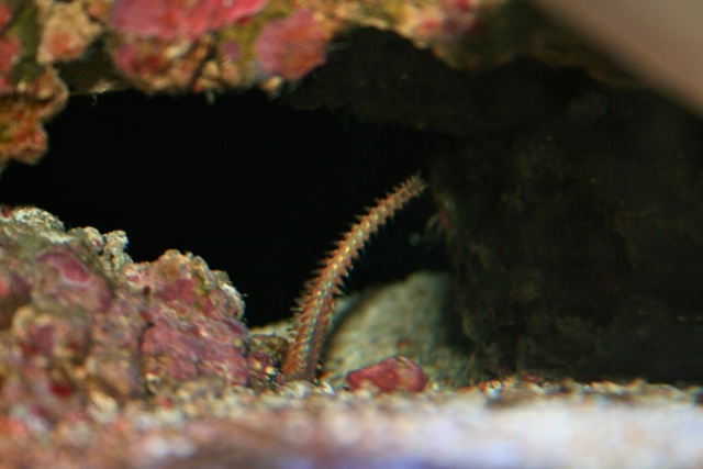 Har nu haft baljen oppe at køre i 4 måneder, og alt kører fint. MEN i går fik jeg pludselig øje på denne drabeligt udseende fætter, som må være komme med de levende sten. Synes godt nok den ser ret ubehagelig ud... Den er ca. 7cm lang, og det virkede som om, at alle de små "tapper" ned langs siden er ben.