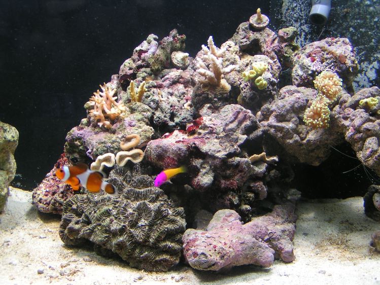 Der er kun et par clarkii-klovne i udover den lille lilla og gule bandit. De har i hvert fald ingen problemer med rejer. Så det minder lidt om din gamle besætning.