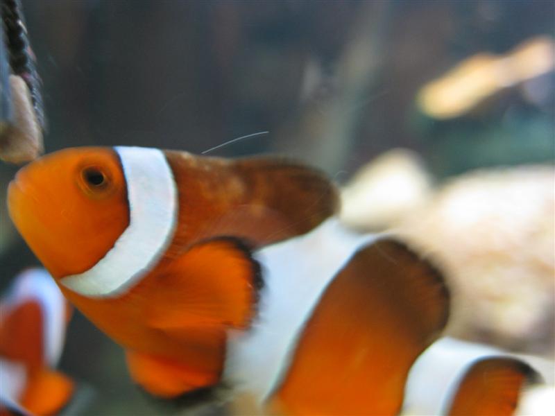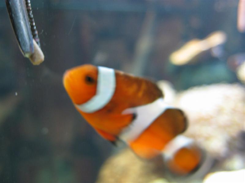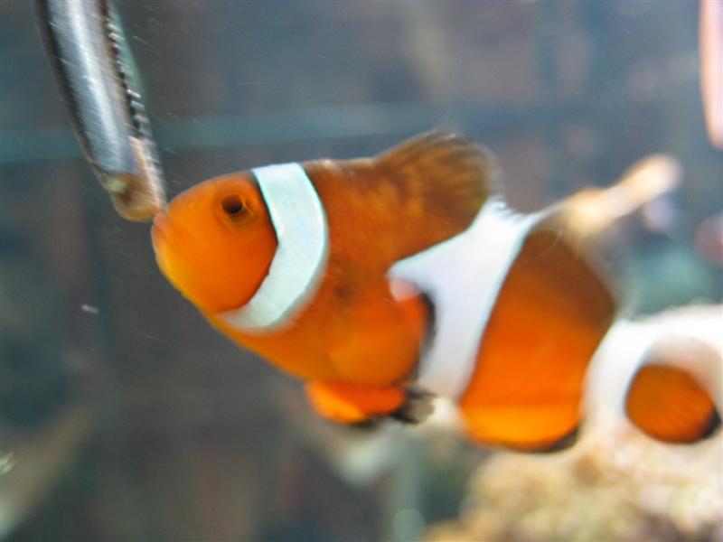 Har haft mit klovne par (Amphiprion ocellaris) i snart tre uger og de har svømmet fint sammen, som et yndigt par indtil nu. Den store af klovnene er af og til begyndt at hakke efter den lille. De kan svømme fint sammen i en time, og så i den næste jager de hinanden. Den lille fisk har fået nogle ordentlige dask over nakken, den har tydelige bid-mærker (mangler skel).