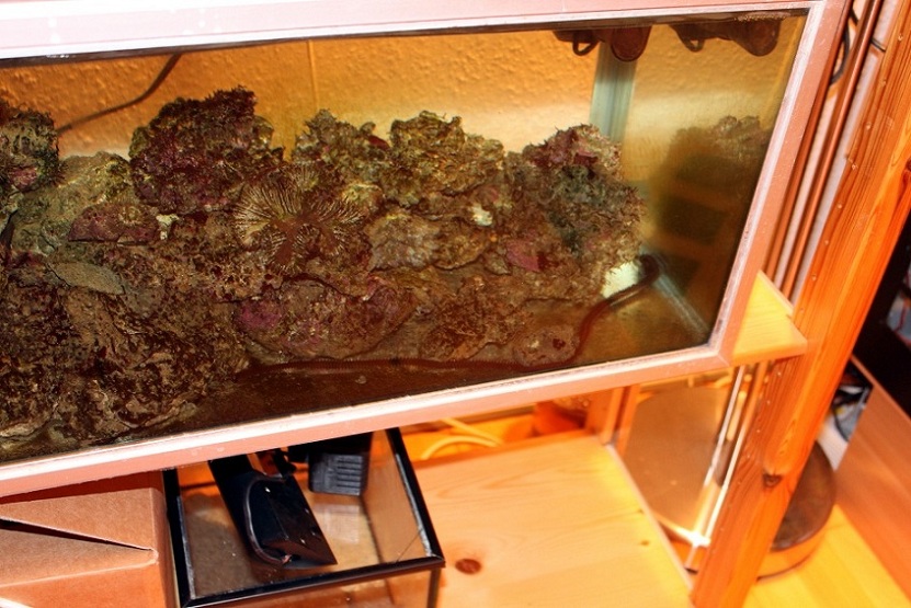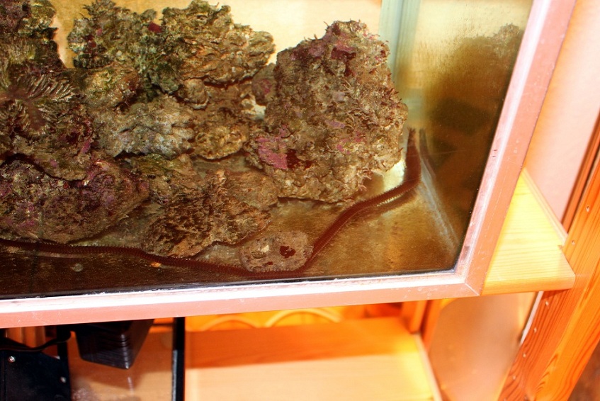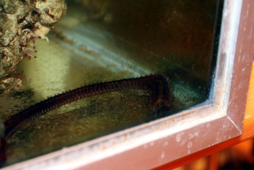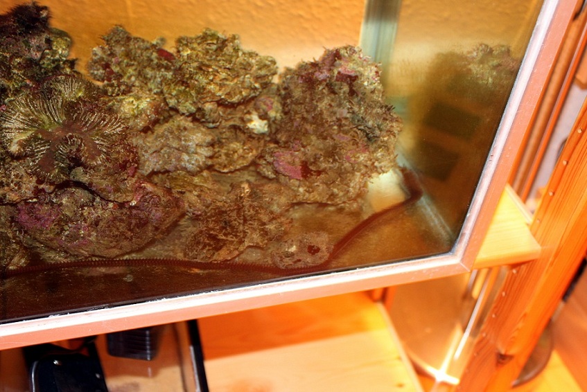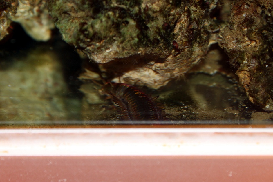Jeg var lige oppe en sen nattetime og fik øje på denne lille afskyelige fætter i mit karantæne akvarie, en Eunicids orm på 40-50cm og den syntes jeg da lige at i skulle se også: