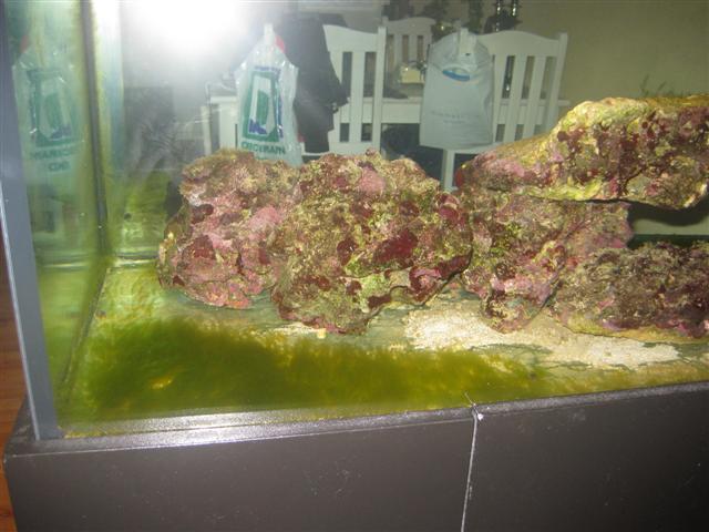 Der er ca 40 kg levende sten i akvariet plus 6 kg i sumpen. Der bliver spæddet lidt op når mit 58 L bliver tømt der er ca 7 kg.