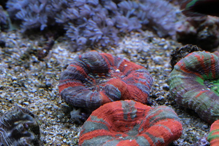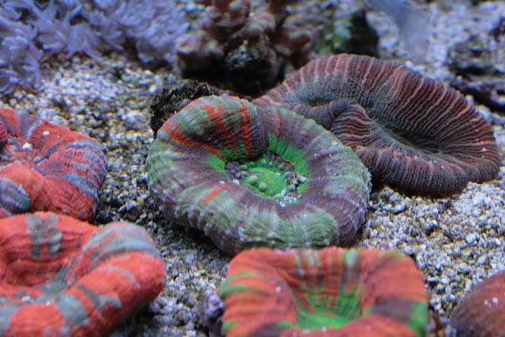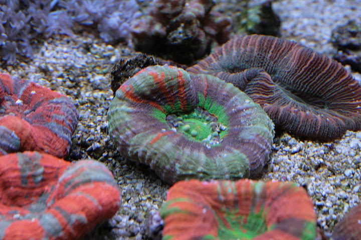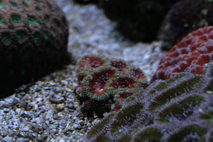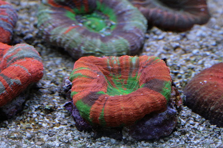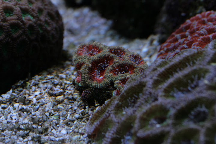 Man kan ane min røde aussie scolymia og skriggrønne Tracophyllia i bunden af billedet.