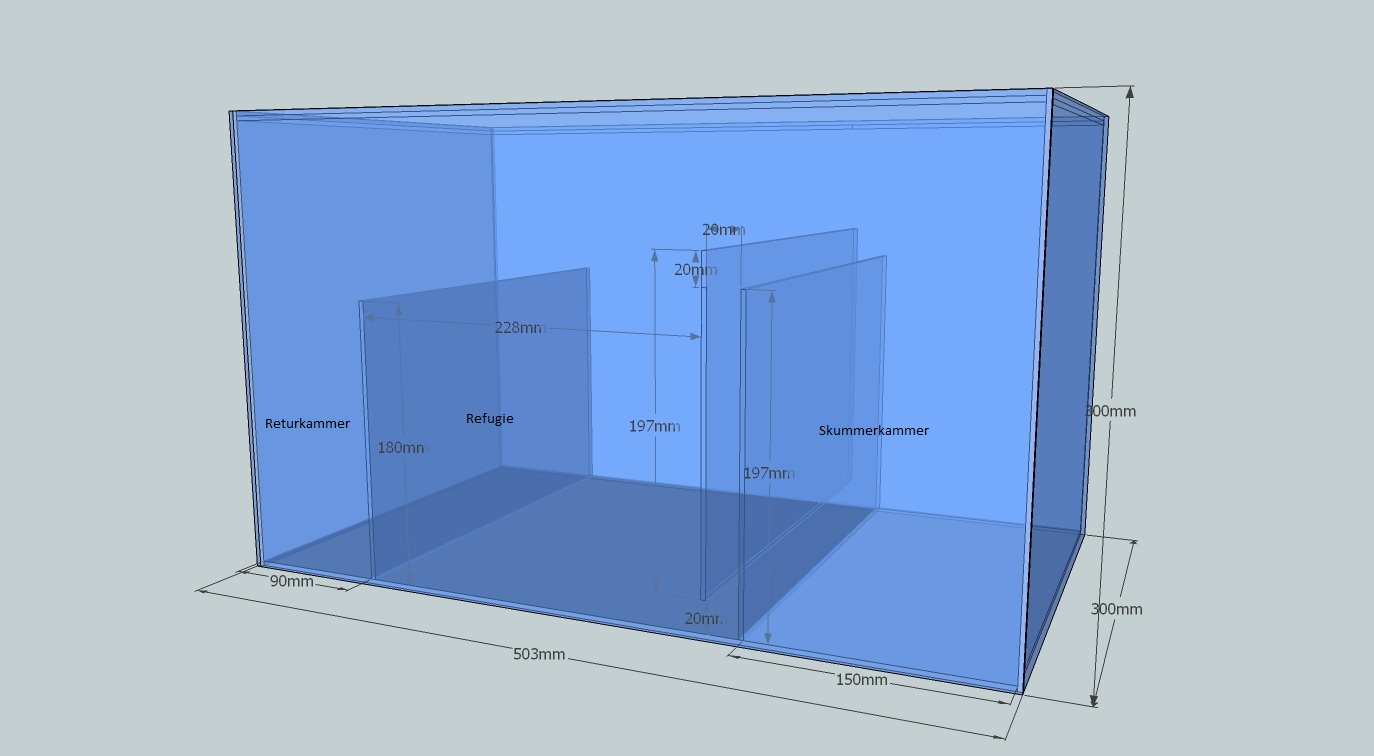 Display tanken bliver på 60x50x45 og sumpen skal kunne stå under dette. Så nogen kommentarer til det? Har tænkt på om skillevægen fra refugie til retur og boblefælden skal være noget højere...