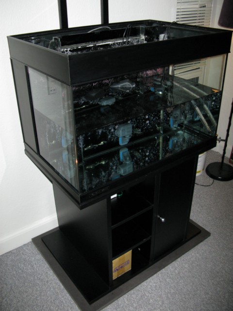 Jeg købte akvariet brugt d. 8./2. 2010 inklusiv original Aqua Medic Turbofloter Percula som bliver drevet af en OceanRunner 2500 med nålehjul. (vistnok en T-flotor 1000 modificeret af AM til at passe i sumpen). Derudover en AM 1000 ltr/t retur og to AM 1000ltr/t cirkulationspumper. Til sidst fik jeg også en AM Oceanlight 150W HQI med.