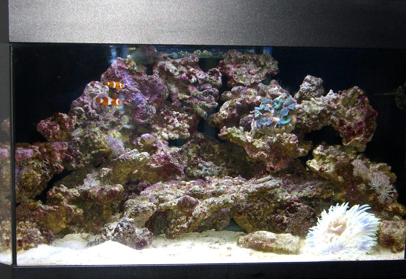 Der er ca 35 kg levende sten i akvariet, bygget op med lidt udragende sten hist og her. Lidt svært at se på billederne.
