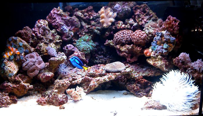 Det er ca 3 mdr siden der kom vand i, og evter ca 2 mdrs utålmodighed fra en "bekendt i huset" ... røg der klovne + eremitter + hugo i baljen. Disse har igår fået selskab af Bi-color + palet + rejer.