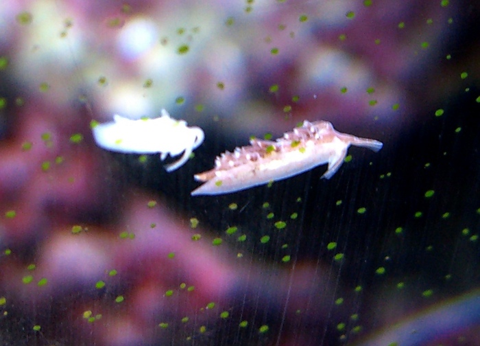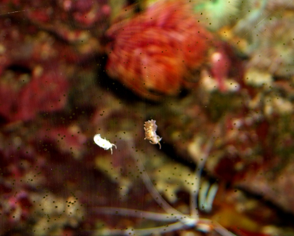 Jeg fandt nu her flere måneder efter opstarten, et par sjove dyr på frontglasst. De er kun ca 1 cm lange, og ligner søharer.