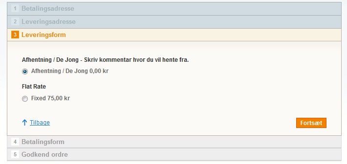 Under leveringsform, står der kun flat rate, fixed kr. 75,- og nix weiter.