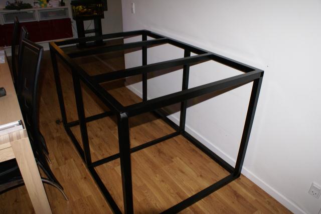 Få svejst nogle små plader på så du kan skruge planden (pladen akvaiet skal stå på melleme boret og akvariet ) fast til stelet så bliver det klippe stabilt.