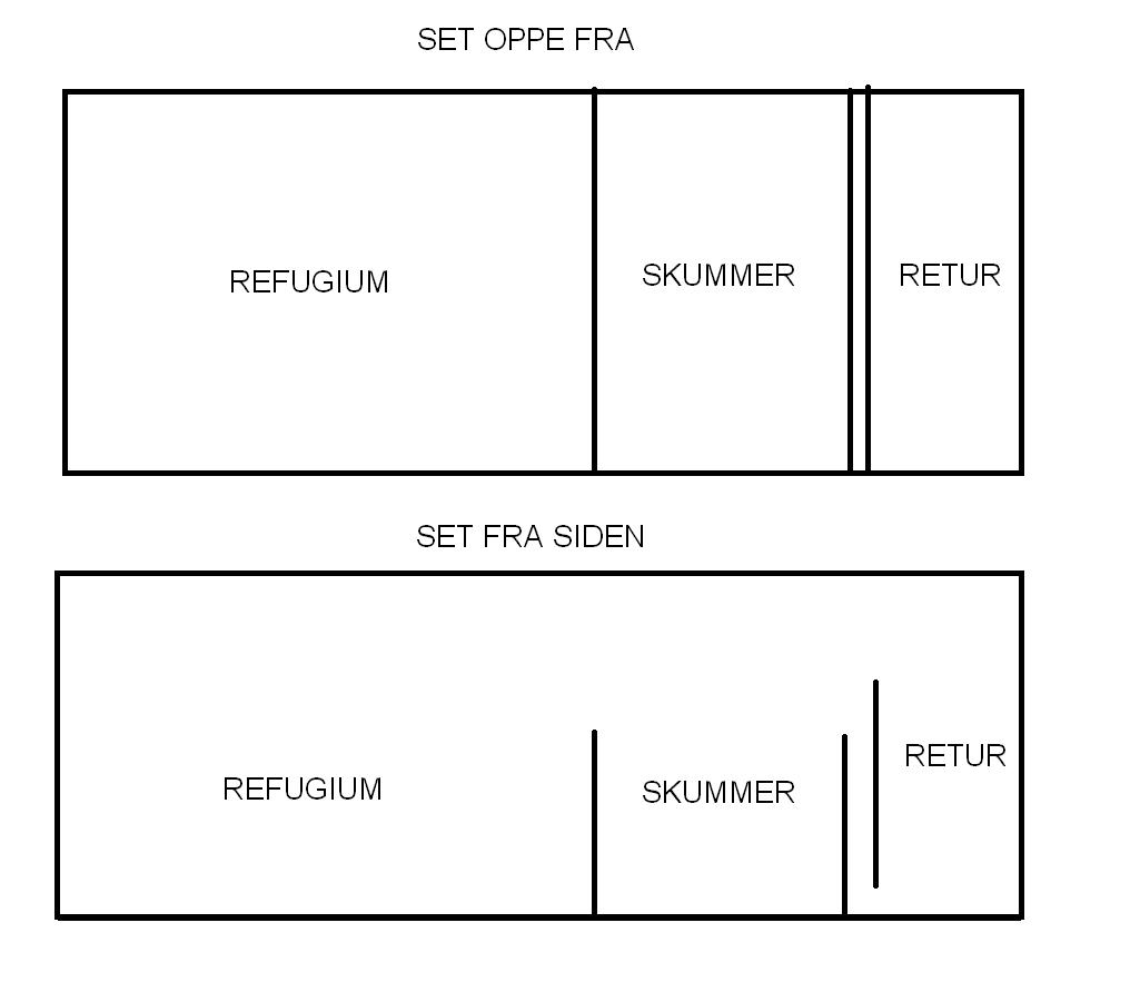 Sumpen bliver på 112 L (80x35x40cm) hvor der bliver et rum til skummer, returpumpe og et refugium. Vandet fra akvariet bliver delt i 2 og halvdelen går direkte til skummeren og resten til refugiet. Derved opnår jeg at der kommer langsommer vandflow igennem refugiet og håber at give bakterier, alger og pods bedre betingelser for at formere sig. Ville gerne have lavet sådan at refugiet strømmede direkte til returpumpen med det blev for besværligt. Belysningen over sumpen bliver en 15W T8 grolux-rør som kommer til at kører forskudt af lyset oppe i akvariet for at stabilisere pH.