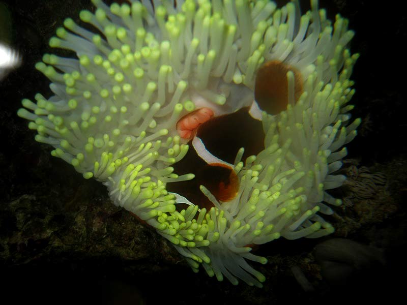 Anemone ser ud som om den er ved at falde ned, den har løsnet sig fra stenene og hænger kun i en enkelt lille hudlap