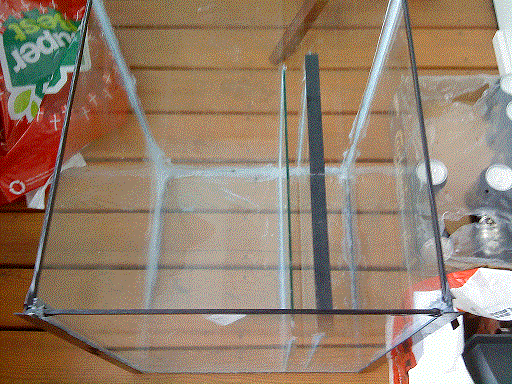 Fordelen ved at man også lader returrøret gå ind gennem overløbet, er hvis der skulle ske noget med rørgennemføringen så vandet lækker, så vil det kun være vandet i overløbet som kan løbe ud på gulvet... (Der skal dog stadigvæk være et hul i returrøret inde i selve akvariedelen, for en sikkerheds skyld.)