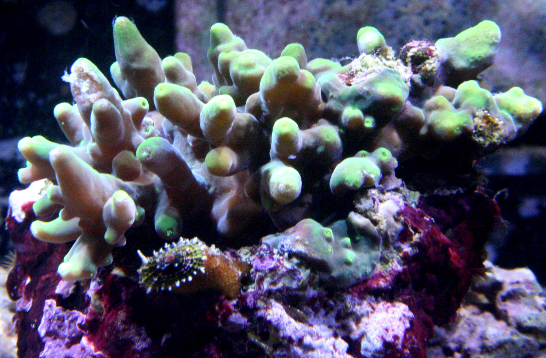 Jeg har desuden netop opdaget at der bor en krappe i den nye acropora, som skulle være en dybhavs acropora. Krappen kunne jeg dog ikke få lov at tage et billede af lige nu, men den var uden hår, havde sorte "80´er solbriller" på eller sort zorromaske hvis det gir bedre mening.