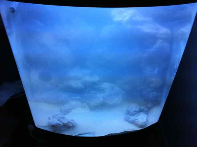 Her efter putte jeg ganske forsigtigt det meget fine levende sand i som jeg havde fået anbefalet at købe. Det var helt bevidst at jeg kom sandet i bagefter da jeg har fået fortalt at stenene helst skal ligge på bunden og ikke ovenpå sand for stabilitens skyld. Det slørede selvfølgelig vandet en del at hælde sandet forsigtigt i og her et par dage efter er vandet klart igen.