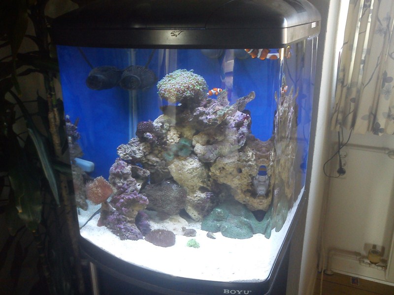 Jeg startede med et St. 128 liters boyu med 150W hqi og 32L indbygget sump. Det er nu solgt og jeg købte et andet boyu, dog kun med rør i amaturet. Men her var alt hvad jeg søgte, nemlig en mindre lampe (har næsten kun blød koraller), og en sump der var lavet underneden. den indvendige sump var jo så fjernet.