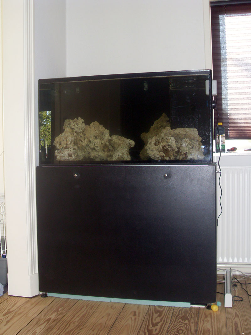 Efter snart 6 måneders læsen og undersøgen fik jeg endelig modet på at få købt mig et akvarie. Jeg havde forelsket mig i shallow reefs, kombineret af ”halvøer” og øer; som en slags laguner under vand. Da dagen kom blev det et 250L (100x50x50), på et porsa stel, med hjemmelavet skabsplader i 12mm MDF plader. (Tak til Buddy for at sælge sit gamle akvarie)