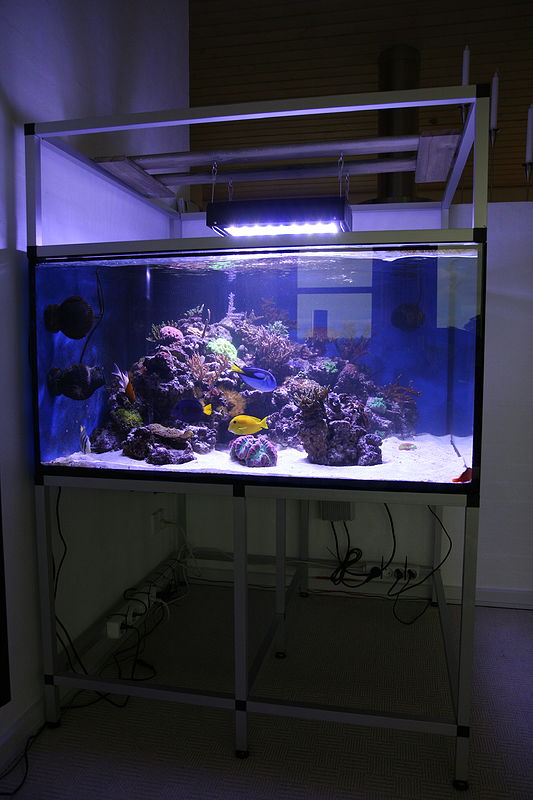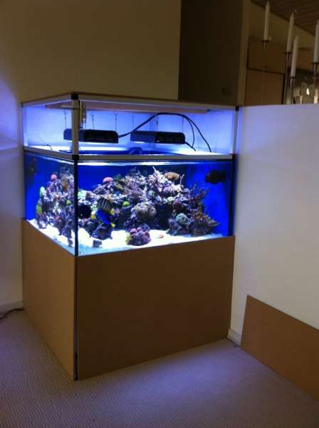 Så fik vi lukket og solgt det gamle 720 L, og startet et nyt og mindre akvarium op i det nye hus. Da det nye står op af en halvmur er teknik og sump flyttet ind på den anden side af en mur, ind på kontoret, hvor det skal indbygges i et skab så det ikke bliver et problem med larmen på kontoret.