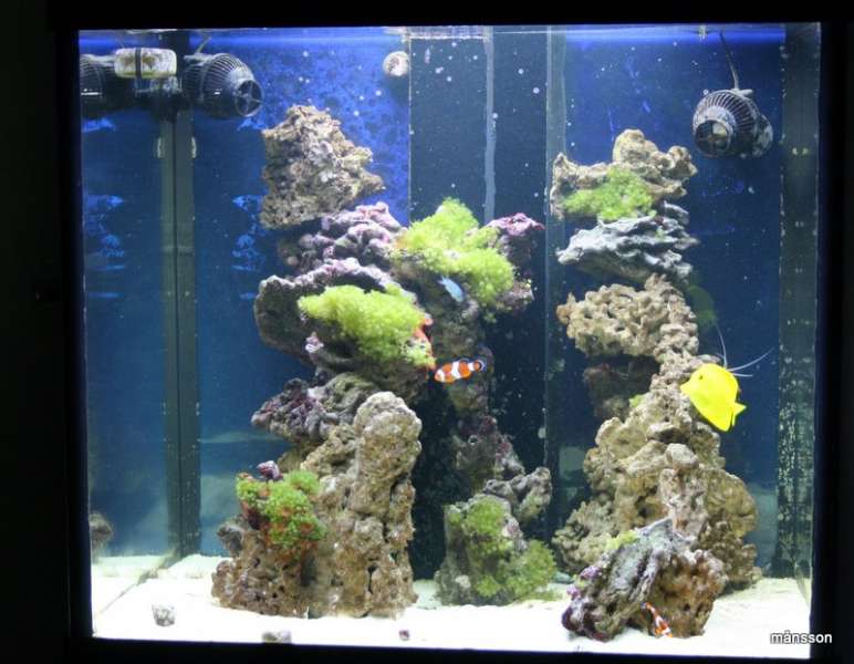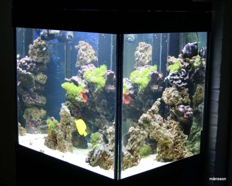 Lidt billeder efter ca 2 måneder! Jeg har blandet stenene godt, så der er tørlagte levende sten og levende sten fra Monnus´s nedlagte akvarie. De tørlagte sten er allerede fyldt med liv og de lilla/lyserøde kalkalger er ved at gøre deres indtog...