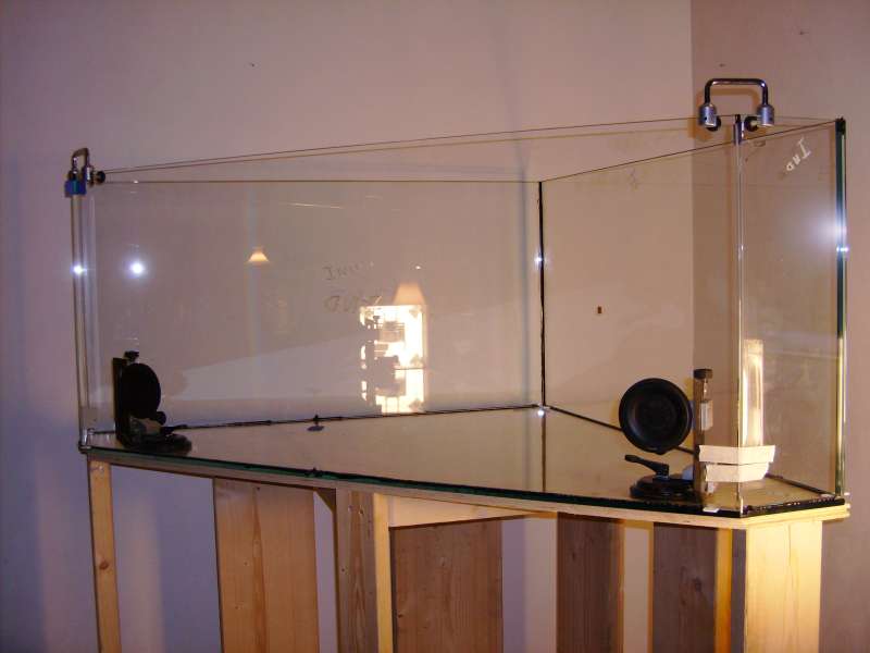 Akvariet måler 1250*1250 mm panoramaruder 250*250 mm Frontglas 1420 mm Højde 600 mm.