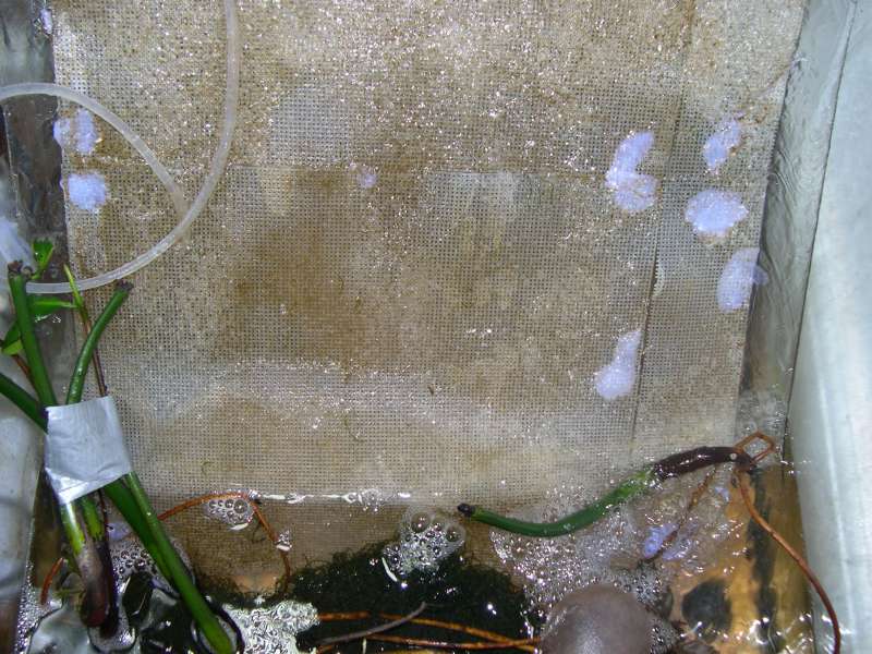 Jeg kører med lodret canvas og vand fra overløbet. Har brugt et kop til at ridse canvas med. Lyset er alm. sparepære i 2 arbejdslamper.