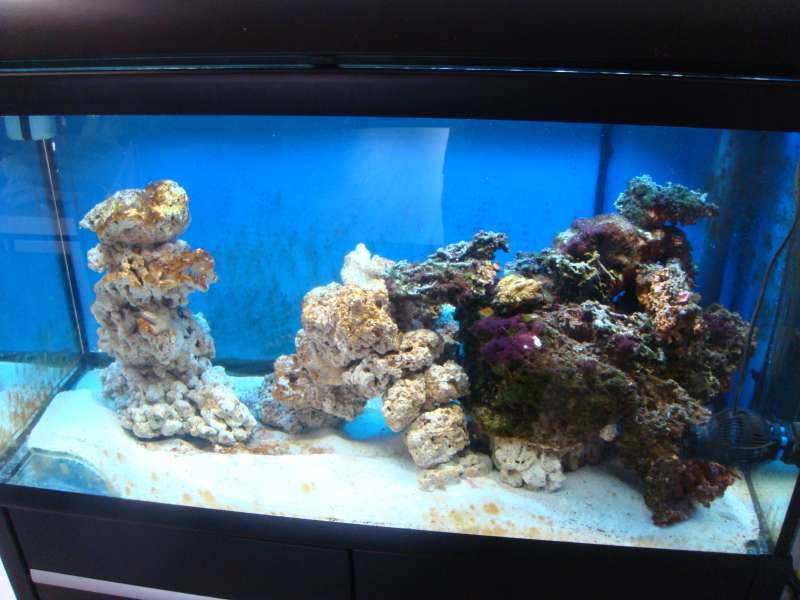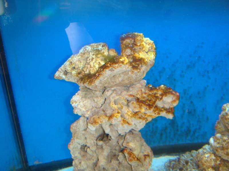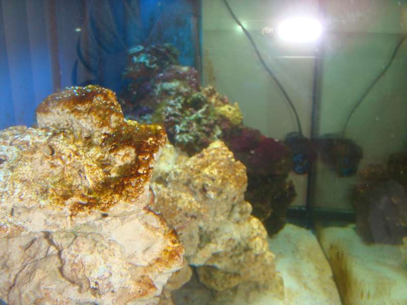 Først og fremmest er jeg i tvivl om det allerede fra staten er muligt og få cyano? De mørkerøde slimede plamager har bredt sig temmelig meget! Det begyndte at dukke op kort efter de levende sten var kommet i. De eneste steder der er ramt, er de levende sten, dvs. ikke noget på de døde søjler og bundlaget??