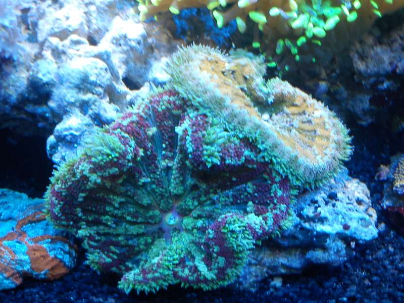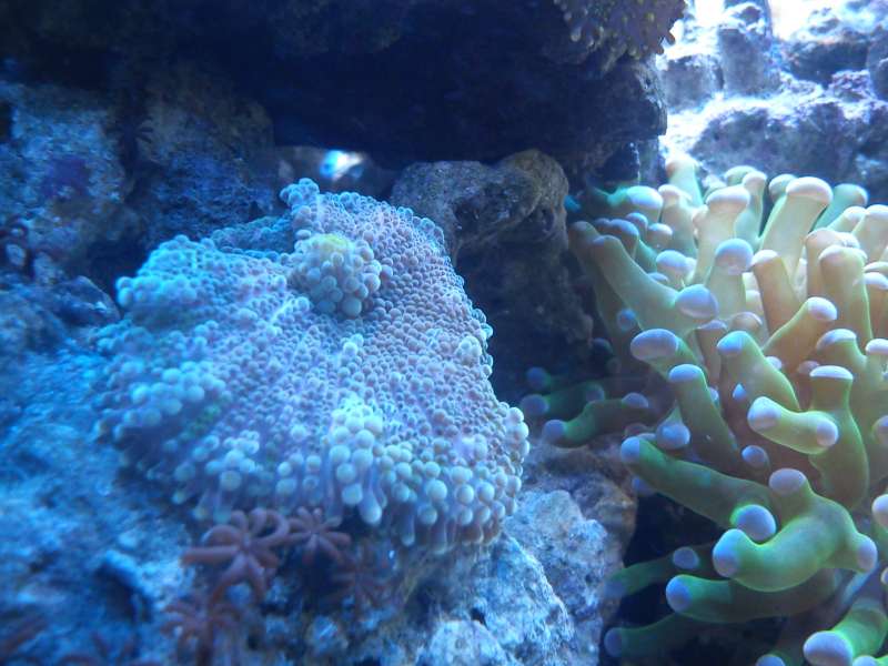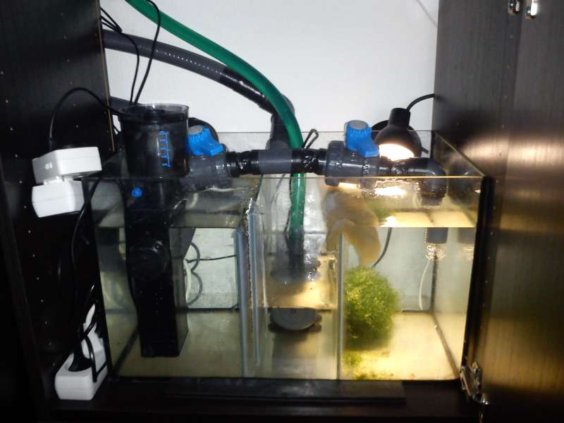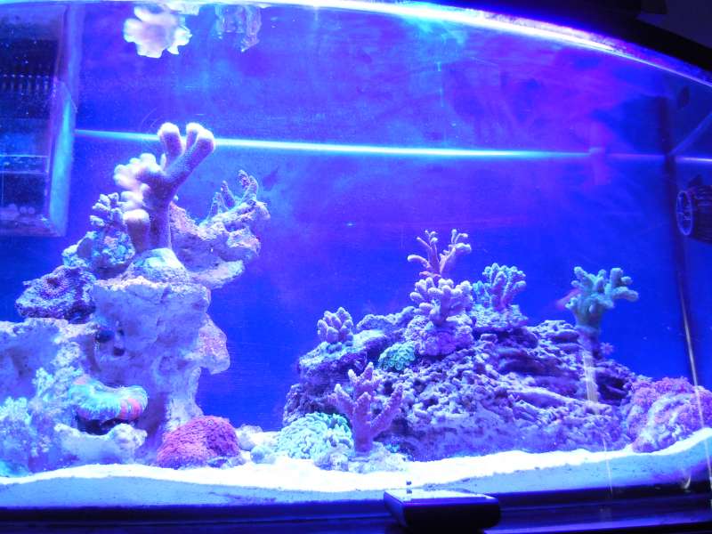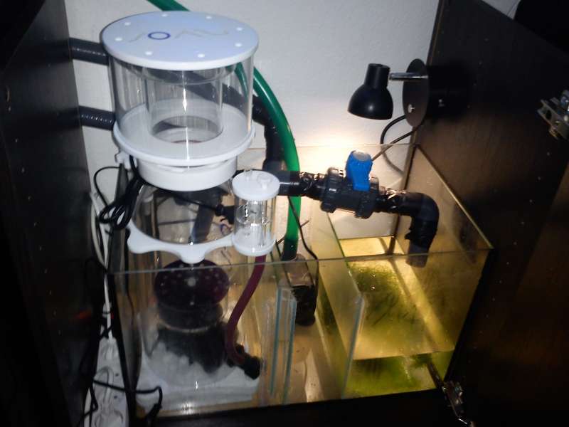 Sump : 45l delt op i 3 rum m. boblefælde mellem skummer og retur. Refugium med chaetomorpha i højre side