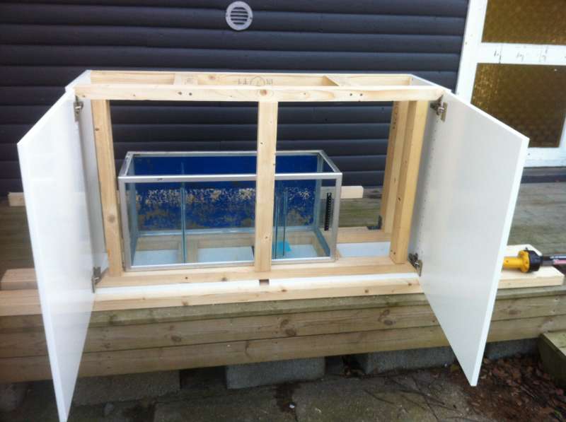 Det ville jeg helst bare have været fri for, da jeg synes det er så grimt at akvariet står og "svæver" over skabet.. Men det kan godt være jeg skal gå tilbage til den løsning igen og så bare vælge en 10 mm finer plade..