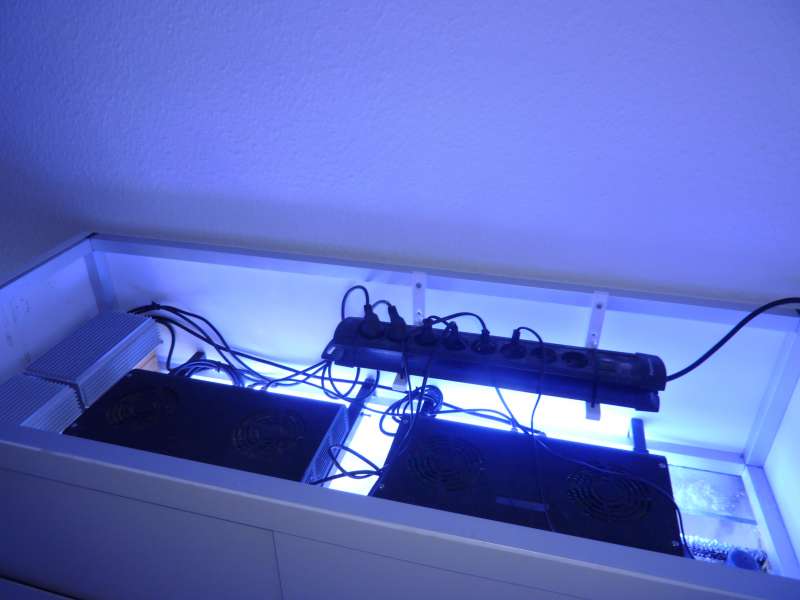I mellemtiden har jeg prøvet at udnytte ventetiden optimalt. Vi synes der manglede lidt hyldeplads i underskabet, hvilket jeg løste ved at bygge en fin lille reol efter samme komcept som Nicki havde lavet til at stille sin computer på, og det spiller bare. Nu er der både plade til strømskinner og lidt ekstra udstyr dernede. Samtidig synes jeg der manglede en for for holder til en strømskinne i lampeskjuleren således, at der kun kommer en ledning ned deroppe fra. Dette løste jeg ved at bore to små huller i porsas aluminiumsstel og montere to hyldeknægte omvendt, så nu hænger der en dejlig stor strømskinne i lampeskjuleren med stik nok til at holde lamper samt de kommende cirkulationspumper kørende :GO