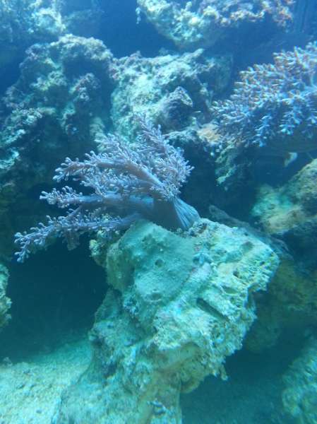 Jeg synes det tager sig fint ud, Det er jo et "nystartet" akvarie;) Fine kenya-træer og Zoa. Umiddelbart er din blå fisk en Damsel af en slags.