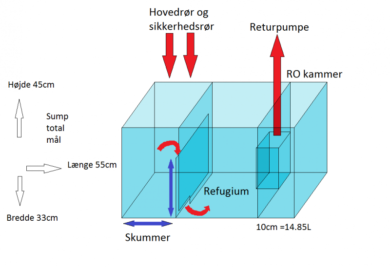 Bredden, også indikeret med blå pile, er jeg også i tvivl om, umiddelbart tænker jeg at jeg skal have over 25cm eftersom skummer længde er dette. Men er dette smart, jeg har på nuværende tidpunkt ikke overvejet diverse reaktorer, men det kunne jo være det blev interessant med tiden, derved skyder jeg jo mig selv i foden hvis jeg kun laver bredden 25cm? Problemet er her, at det selvfølgelig går ud over refugium pladsen.