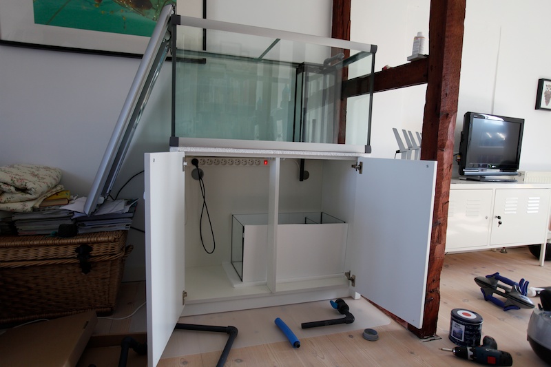 teknik skal indbygges i skabet, inkl. køleren, så der er lavet visse modifikationer til opsætningen, hvilket Nils fra Klovnefisken, hvor akvariet er købt har været meget behjælpelige med.