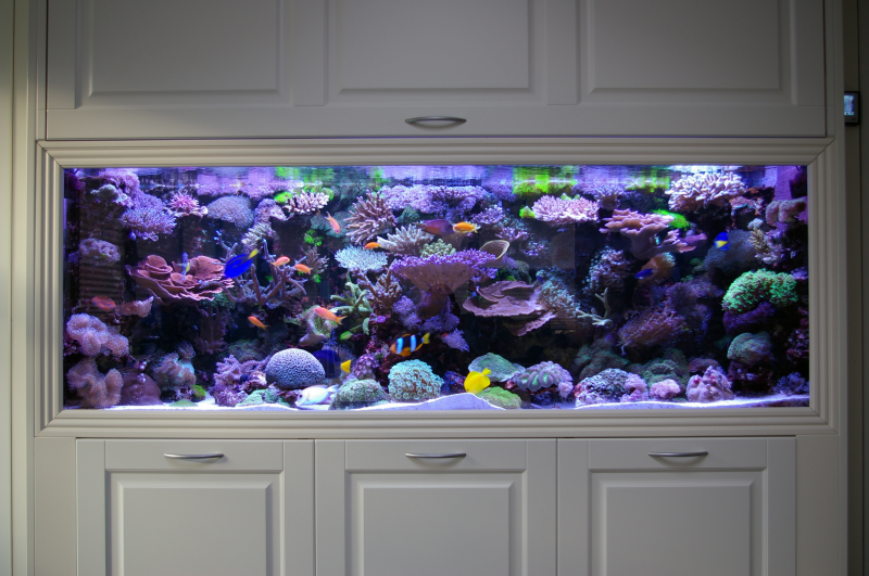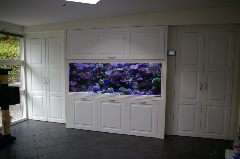 Akvariet er bygget ind i en væg for enden af vores ene stue. Væggen er opført til samme formål med adgangsmulighed i begge sider, under samt over akvariet. Låger er fra Designa Køkken. Alt arbejde er udført af mig selv.