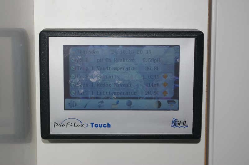 GHL Profilux Touch-panel til betjening og overvågning af systemet. Man kan bl.a. se og justere temperatur, pH, salinitet, redox, starte foderpauser (hele 4 forskellige), starte andre events, f.eks. stoppe skummerpumper (hvis koppen skal demonteres), rense skummeren etc.. Der er næsten ikke den ting, man ikke kan indprogrammere.