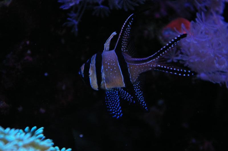 Da så en af vores gode venner, som har en dyrehandel i lokalområdet (Desværre ikke med salt), anskaffede sig et lille 105 liters Aqua-El salvandsakvarie med indbygget skummer og det hele - var jeg sgu solgt. Jeg måtte simpelthen også have fingrene i sådan et, og det fik jeg, og jeg fik trådt mine barnesko inden for saltvandshobbyen med dette lille vidunder, som blev indrettet med levende sten, nemme koraller, et par klovnfisk og Kardinalrejer. Vi havde stor fornøjelse med det lille akvarie, hvor vi ofte sad med lommelygte foran akvariet og kiggede, om aftenen efter at lyset var slukket for at se alle de mærkværdige livsformer, der dukkede op om natten.