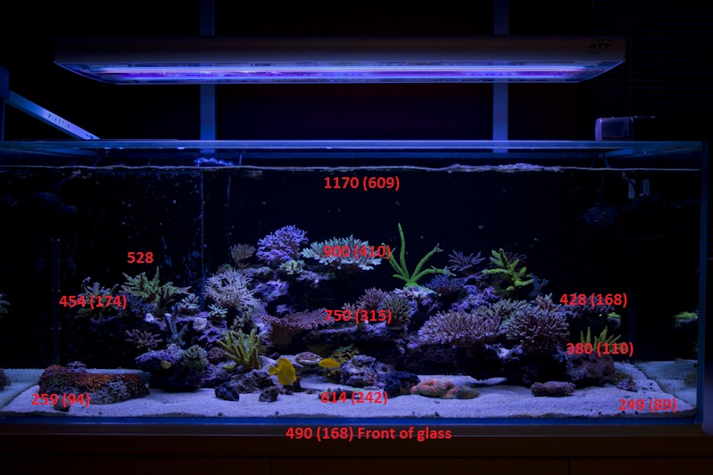 Husker ikke lige de præcise tal, men hos Peder var tallet lige under vandoverfladen over 1000 PAR og et stykke over 200 ved bunden af akvariet, og det er noget højere end det på billedet