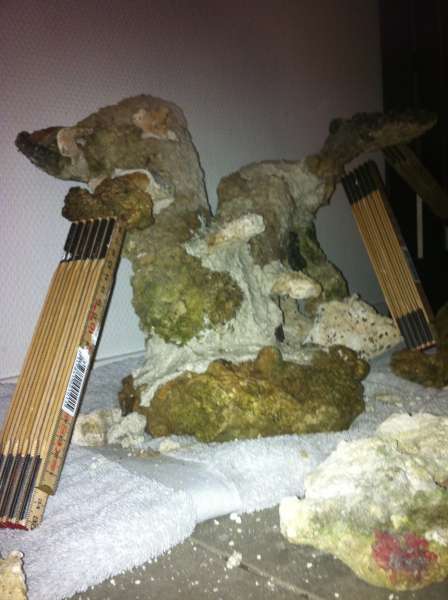 Jeg byggede selv nogle søjler af ca. 25 kg levende sten - slog dem i stykker og satte dem sammen med hvid portland cement, da jeg gerne ville have det skulle være en luftig stensætning. Så måtte jeg selv i gang med at forme dem.