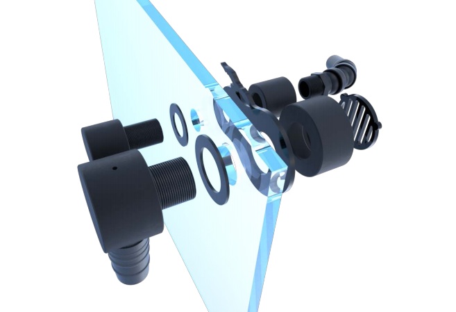 Vinklerne monteres en på hver side, inde i akvariet med åbningen op. og Ude med åbningen ned af.