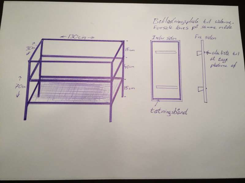 En plade - men hvilken? skal der sættes en skrå vinkel på indersiden, (samme princip som når en skænk eller lign. monteres flyvende på væggen) måske noget alu, som hviler