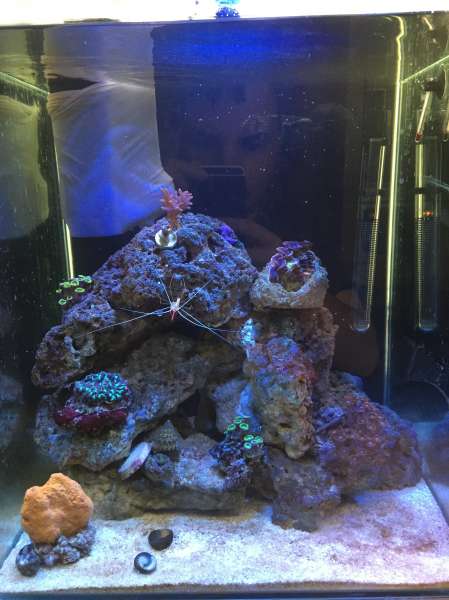 En anemone er er absolut NO-GO i et så lille akvarie. Selv en anemone som ikke ser stor ud i butikken, kan vokse til enorm størrelse i akvariet. Vokse er nok ikke det rigtige ord, men svulme er nok bedre. Og så kræver den ret meget vandbevægelse og masser af lys som vand med fine værdier.