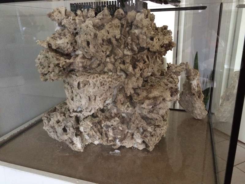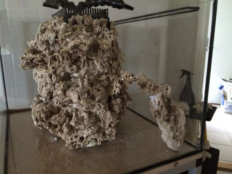 Så er der kommet vand i baljen... 2 gange! De døde sten var så fulde af guf at vandet fik en ret kraftig lugt og grønlig farve derudover gik skummeren amok så den måtte hæves 15 cm for ikke at skumme alt for meget over. Derfor røg alt vandet ud igen og der er idag kommet nyt på, fingers x'ed