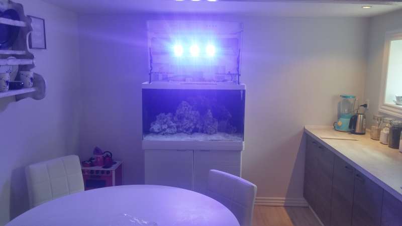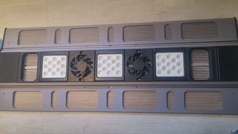 hej alle:-) køre pt. med 70% lys på lampen og blæseren tænder ikke, der er 120g linser i den nye version. og ikke 90g som 160w udgaven. og ved at bore små huller i af toppen kommer led`en af med varmen den vej, har nu kørt ca.2 uger med led og ca. 3 dage med huller i toppen og varmen ligger ca. på 25 til 26grader nu, vilket er mindre end t5rør da jeg kørte med dem. led er 8cm over vandet og faktisk lidt højre end t5 rørene, kan ikke lige se forskellen på det, for så ville t5rør jo også brænde korallerne af...?