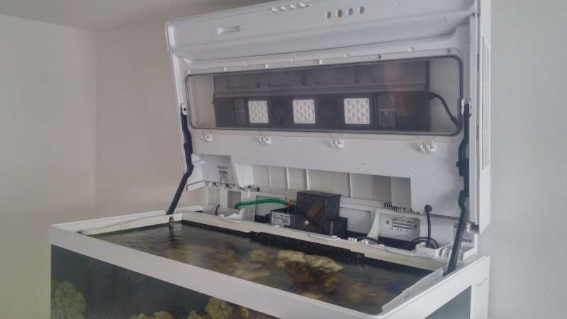 tja måske, der er bare ikke rigtig nogen grund til det så længe den ikke bliver varm, har også pillet blæserne ud i akvariet, så der er mere gennemtræk og et par huller i låget og det ser ud til at være mere end rigeligt, lampen er jo også med termostat, og hvis den bliver for varm ville de to blæser der sidder i led én tænde.