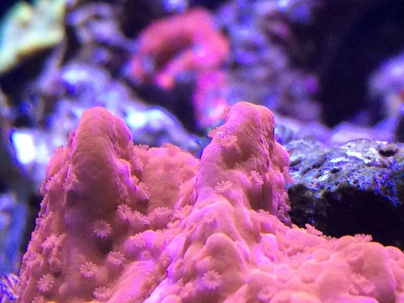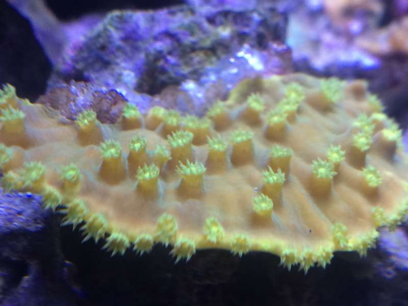 Endelig sker der noget nu har min acropora stået og blivet bredere og breder i meget lang tid uden at sætte skud eller vokse andet end i bredden men nu ser det ud til den sætter grene/skud og så kan det være man kan finde lidt Info og evt id på den.