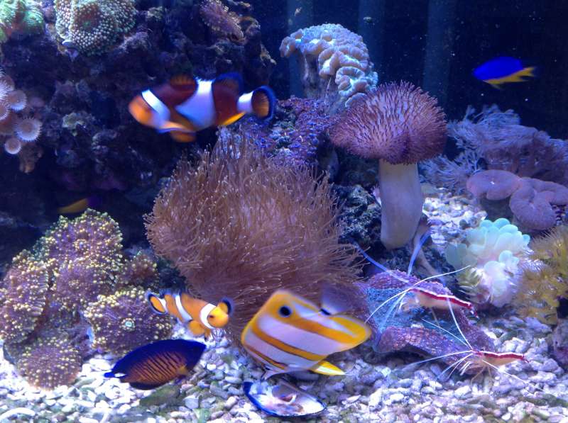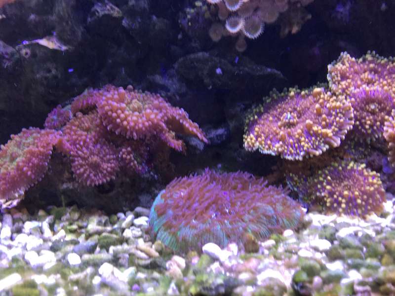 Der kom vand i for et år siden. Det er bygget op omkring to atol søjler. Siden er der tilføjet en del eksta ls. Det har heletiden været , og er stadigvæk meningen at det skal være sjovt og nemt da jeg har fuldtids arb x 100 og en flok unger i alle aldre. Dvs nemme dyr, og lav vedligeholdelse. DSB har jeg syntes længe lød spændende, og er blevet vildt glad for at jeg ikke har givet op under indkøring. Teknikken er to x tunze 6045 og en rw8. Retur et stk tunze silens( ha ) . Lys , maxspect led et eller andet.. Der er ca 140 kg sand i tanken og ca 70 kg ls , i sumpen alger og sand og ls , plus en fandens masse liv.