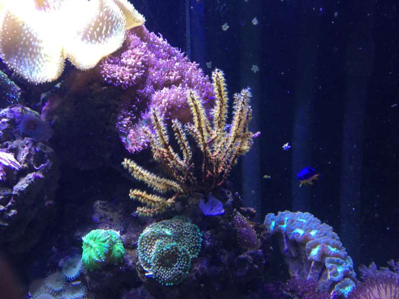 Jo det kører. Selvf er der osmolator og varmelegeme på, men det er så lowtec det nu ka blive. Jeg fodre med ca tre frostterninger om dagen, mest mysis og kril. Dertil en musling ell to plus alt muligt fisk og skaldyr. Det er hr pincet der skal ha mad, og det kommer også systemet til gode.