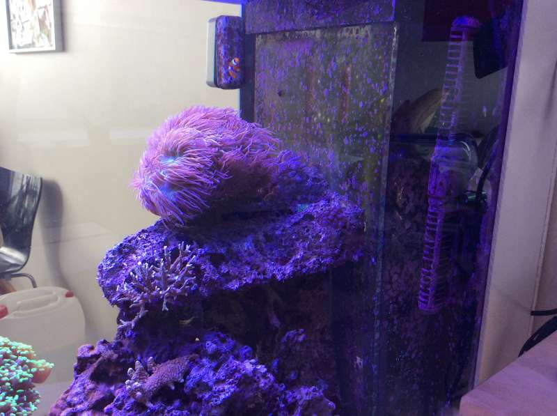Min dag startede super godt ud. Jeg døjer en del med nogle grimme alger, men her til morgen ser det ud til at de er på vej væk. Derudover så jeg også at min flotte mandarinfisk er kommet sig 100 % efter dens, efterhånden mange, eventyr gennem nedløbsrøret. Det gjorde mig glad og fortrøstningsfuld. da jeg her lidt over middag kommer hjem tager jeg et hurtigt kig på akvariet, som altid, og undrer mig over at fiskene stresser rundt! jeg kigger nærmere efter og til min store skræk kan jeg se at beklædningen (ls) på mit overløbskammer er styrtet sammen.... Jeg skynder mig at få stenene op og ser at en af dem har knust en af mine sps koraller.