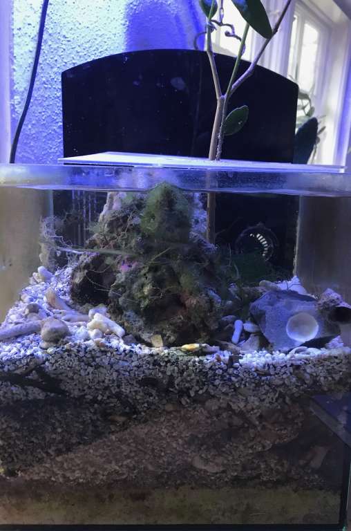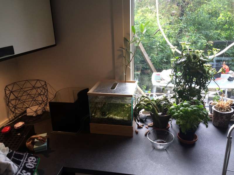 Jeg startede med et aqua-el box 17liter på 26*26*26 og det fik jeg fjernet al teknik og plastik stand/top fra og lavet nyt i træ og givet det skibslak, det er uden lys pumper filter og kun med en meget lille luftpumpe på intet andet.