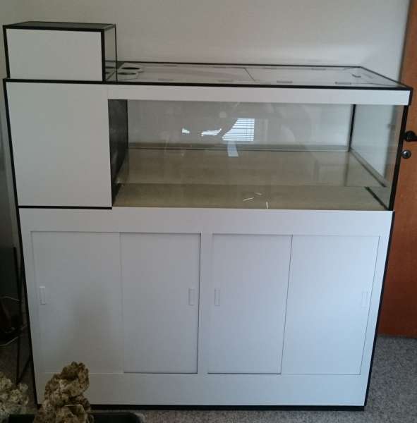 Jeg har selv designet og tegnet akvariet angående indretning, udseende og flere småting. Det er lavet af Claus fra Tropeakvarier, og har målene L130 x D60 x H45 med indvendig sump indrettet som en udvendig. Dog er vandstanden fast på 40 cm, da jeg elsker shallow reef akvarier, og de sidste cm tilovers er med vilje, så der er plads til lidt bølger i akvariet. Det er også en af grundene til, at der er en 9 cm bred bølgebryder hele vejen rundt kontra mit forrige, hvor det ikke kunne lade sig gøre pga. den indvendige sump, som var placeret i midten. Ved det gamle oplevede jeg, at der ikke skulle meget til at lave lidt bølger med risiko for, at det kunne skulpe over. Der er boret to huller i bølgebryderen ind mod sumpen, hvor det ene er til ledninger fra akvariet, og det andet er til min fodercylinder og foderautomat. Der er lavet 2 låg til hullerne, hvor der er lavet en rille i til ledninger. Til om vinteren har jeg fået skåret to stk. akrylplader, hvor der er limet fem små "holdere" på hver plade, så det ser ud, som om at dækglasset "svæver i luften" og flugter med bølgebryderne. Det giver et mere stilrent udseende. Til om sommeren har jeg købt et tank cover, som består af en aluminiumsramme med et finmasket net, så fisk ikke kan springe ud. Jeg er træt af, at miste fisk på den måde